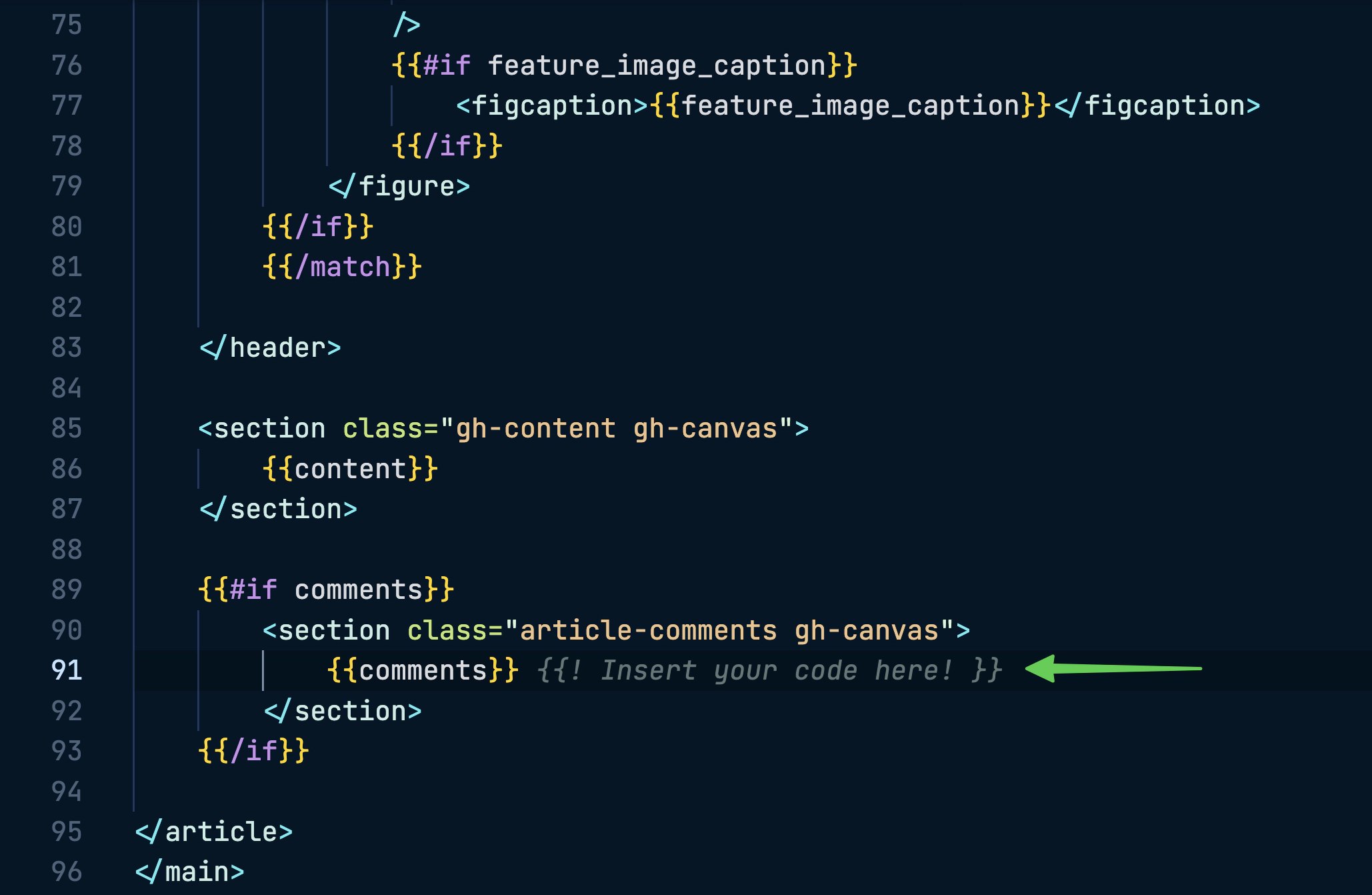 Once your code is good to go, the next step is to paste it into the post.hbs template in your theme files. This template is for all posts on your site. Here’s what our final code snippet looks like in this example: